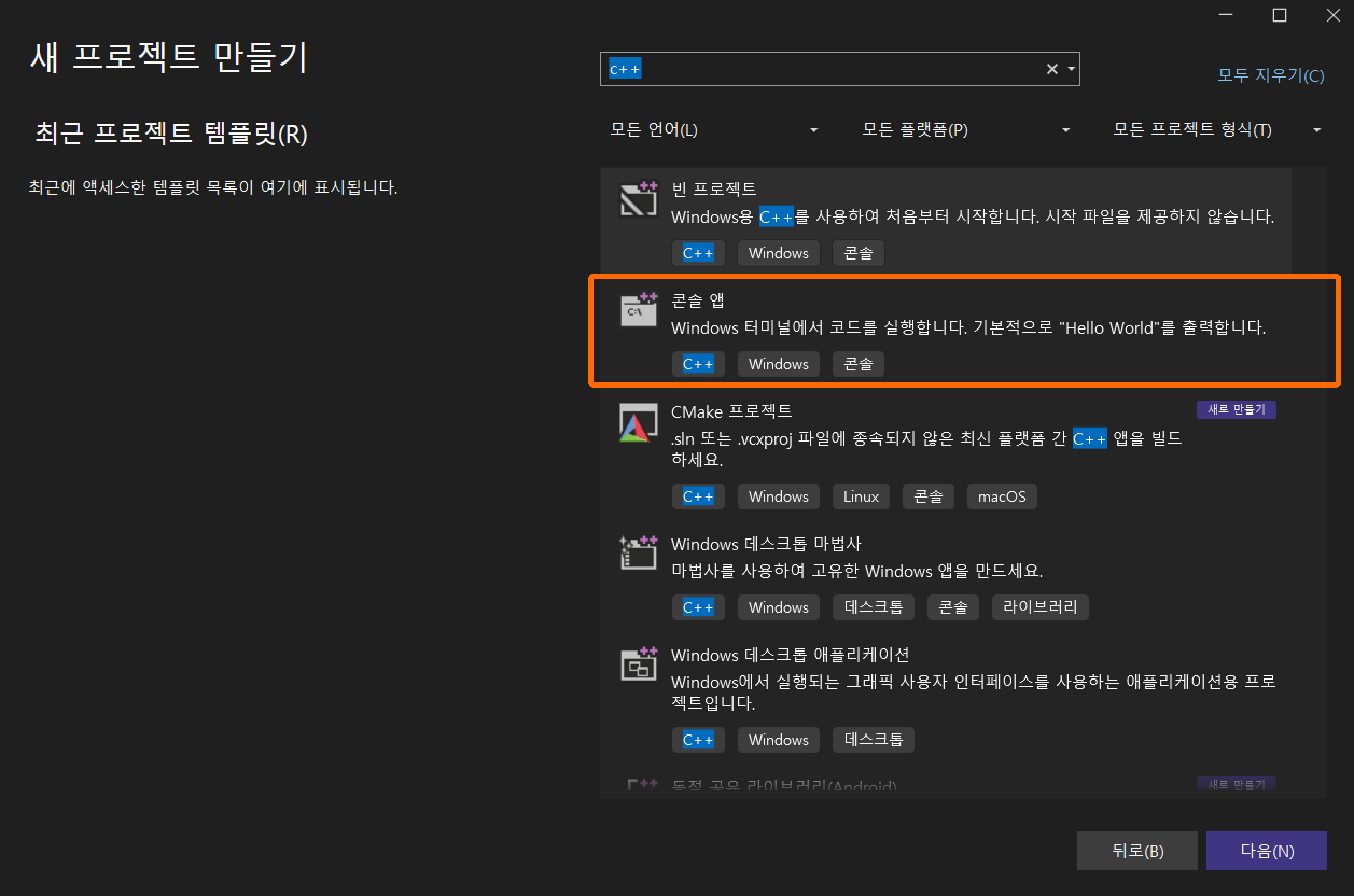 만약 C++ 프로젝트 템플릿이 안 보이면 C++ 워크로드 설치가 안 된 것. Visual Studio Installer에서 “Desktop development with C++” 추가 설치 필요.